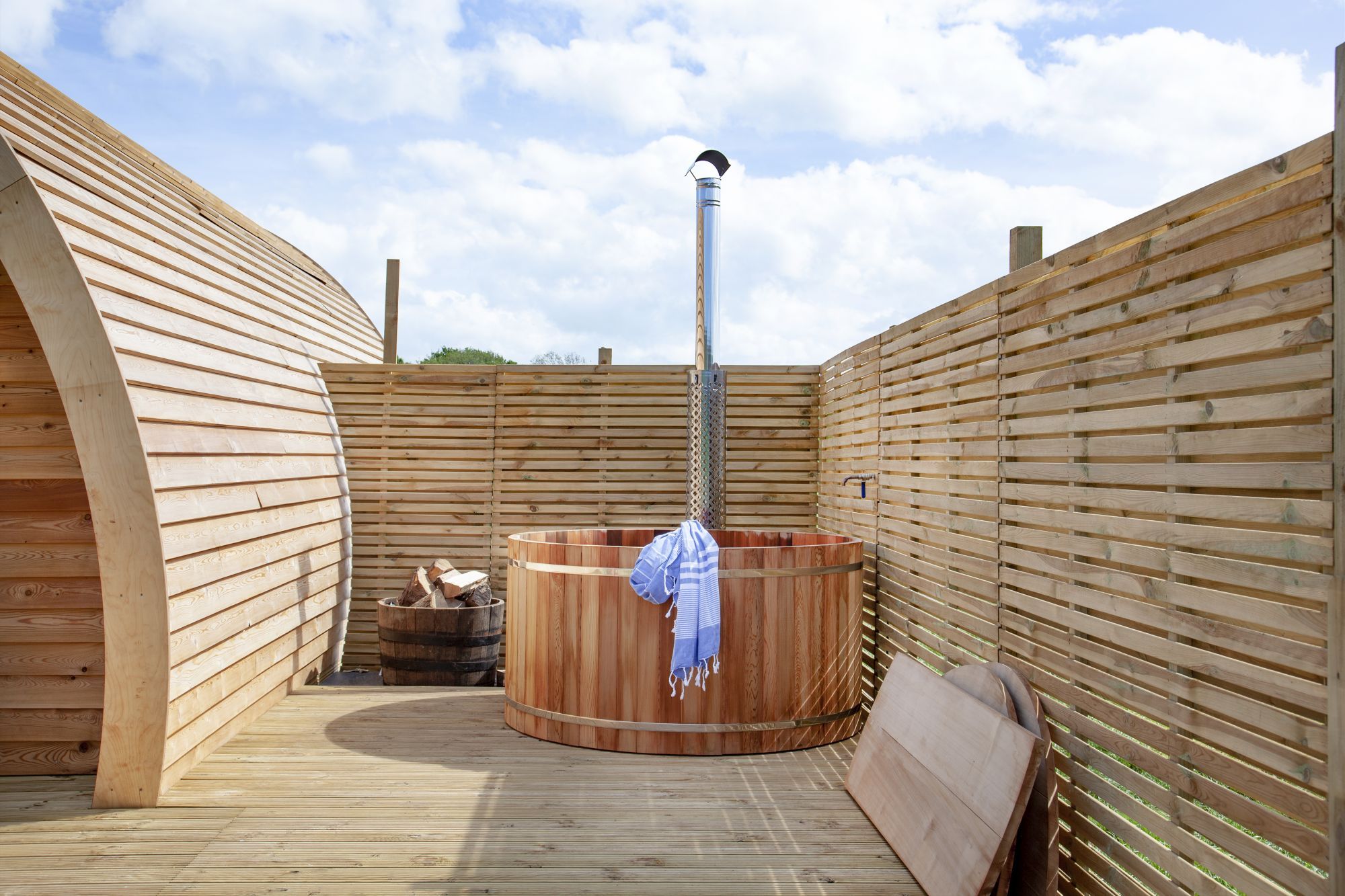 A beautiful eco-glamping pod with luxury furnishings a private wood fired hot tub, a perfect romantic escape. Luxurious features, decadent interior design, and a breath-taking view of the iconic Wells Cathedral, combine to make The Nave pod that extra bit special. Grab your bubbly from the wine cooler and step from the kitchen to the decking outside. Step into your wood fired hot tub and enjoy your secluded spot to enjoy the peace and quiet in style.